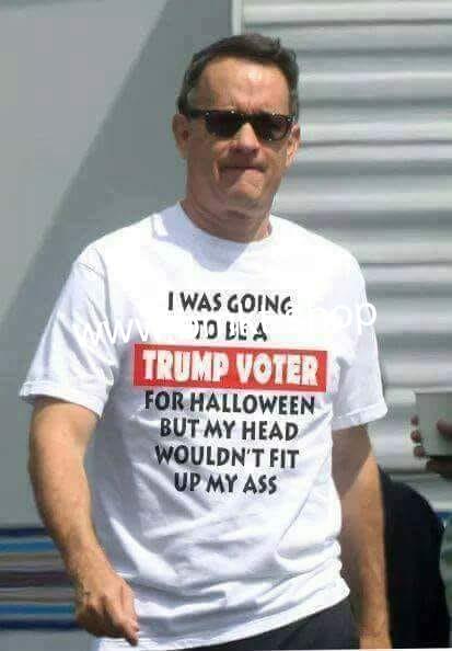 An image that appears to show U.S. actor Tom Hanks wearing an anti-Trump t-shirt is digitally altered. In the original image, published by outlets in August 2022, Hanks can be seen wearing a plain navy t-shirt.