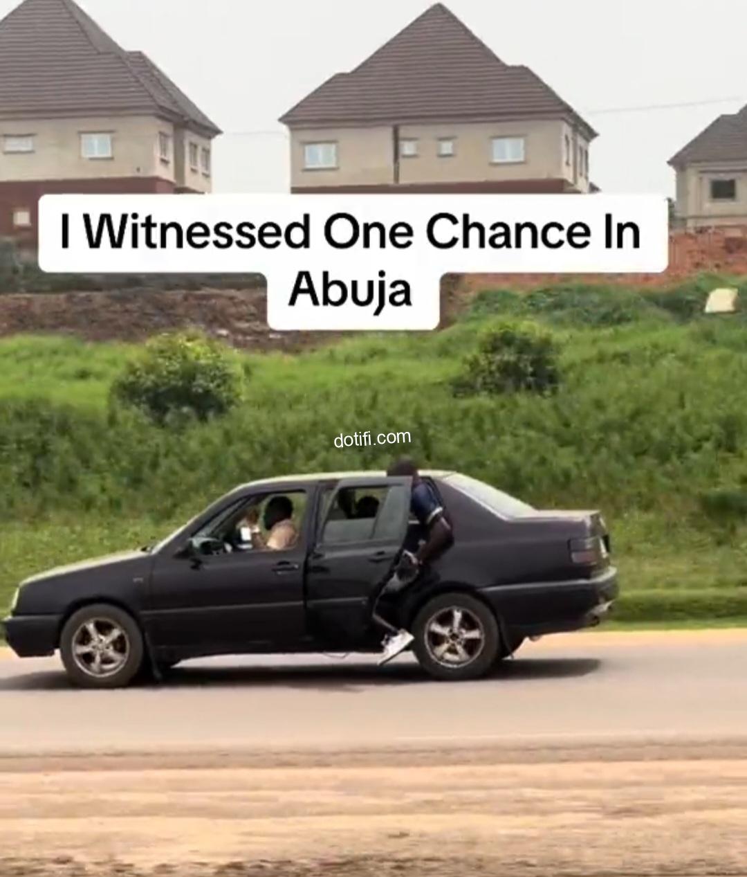 A man was filmed hanging out of a moving vehicle on a highway in Abuja. Food critic, Opeyemi Famakin, filmed the video after witnessing the event shortly after arriving in Abuja. Sharing the video to TikTok, he alleged it was One Chance operators at work. In the video, the man hanging out of the car is seen fighting off someone in the back seat with him. He is later seen reaching to the driver’s seat to struggle with the driver. It appears they were trying to push him out of the moving car. Watch More Videos on video.i.ng. Follow us on Instagram…Powered By ADNG.NG free ads A post shared by … ringroad.com.ng a search engine ( … https://www.instagram.com/swordspress/) The post Troubling video shows man hanging out of moving vehicle while struggling with driver in suspected One Chance attack appeared first on ringroad.com.ng.