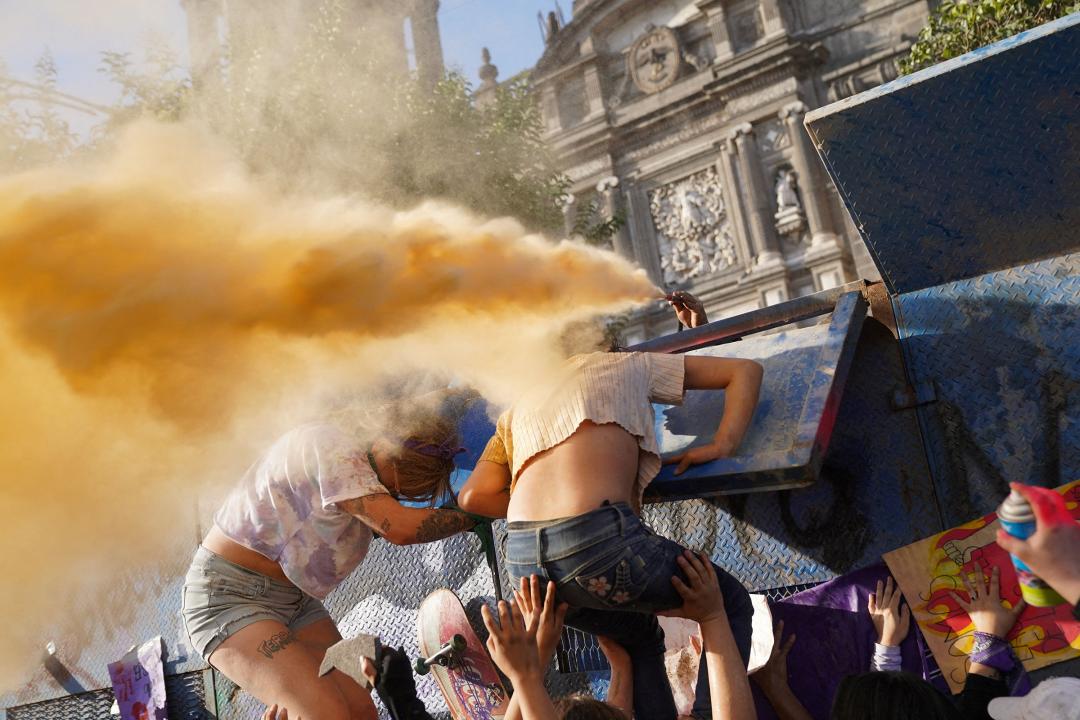 A police officer sprays an irritant smoke at demonstrators during a protest to mark International Women's Day in front of Mexico's National Palace in Mexico City, Mexico, on March 8.
