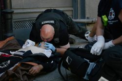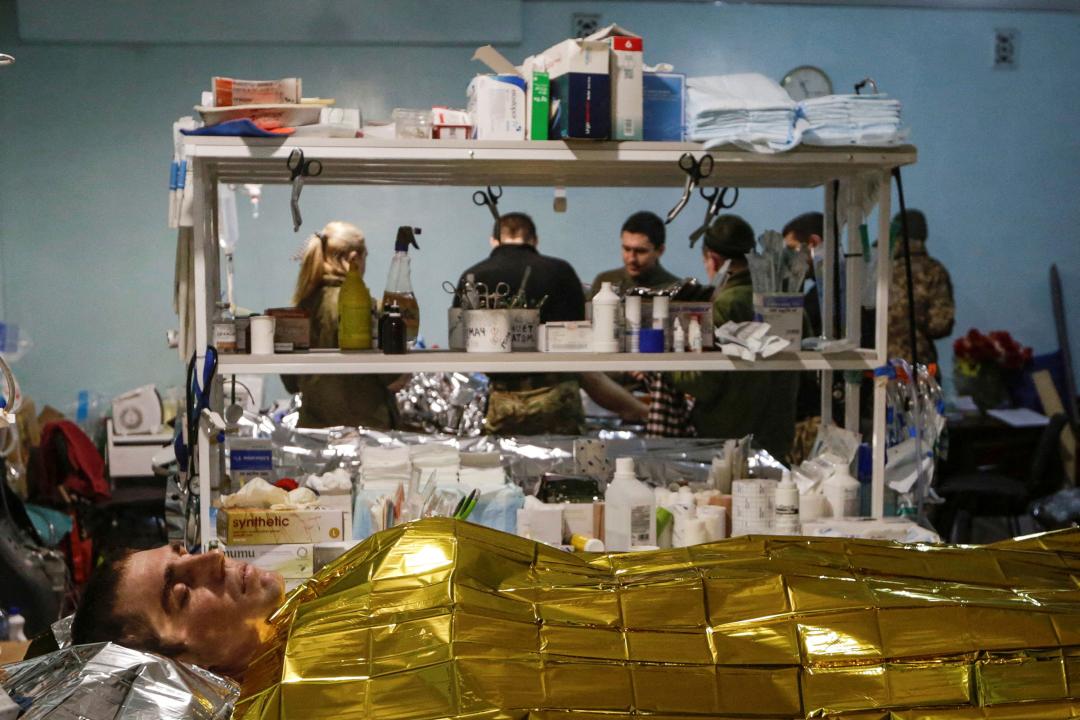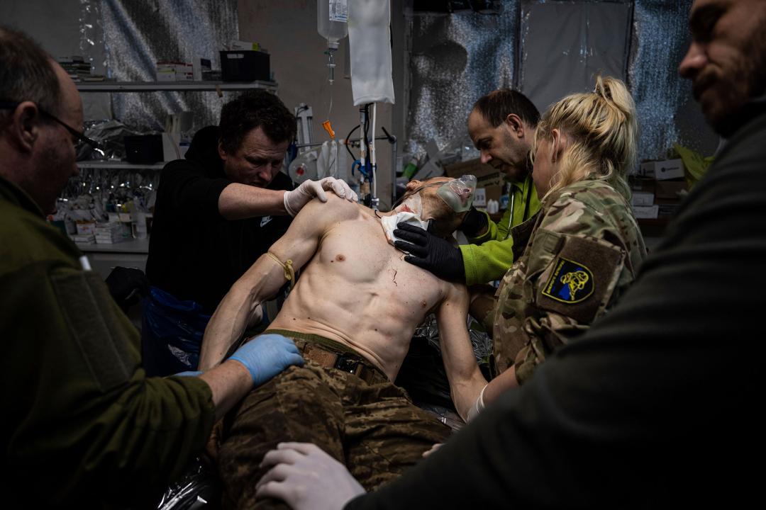 Ukrainian military medics treat their wounded comrade at the field hospital near Bakhmut, Ukraine, on Feb. 26.