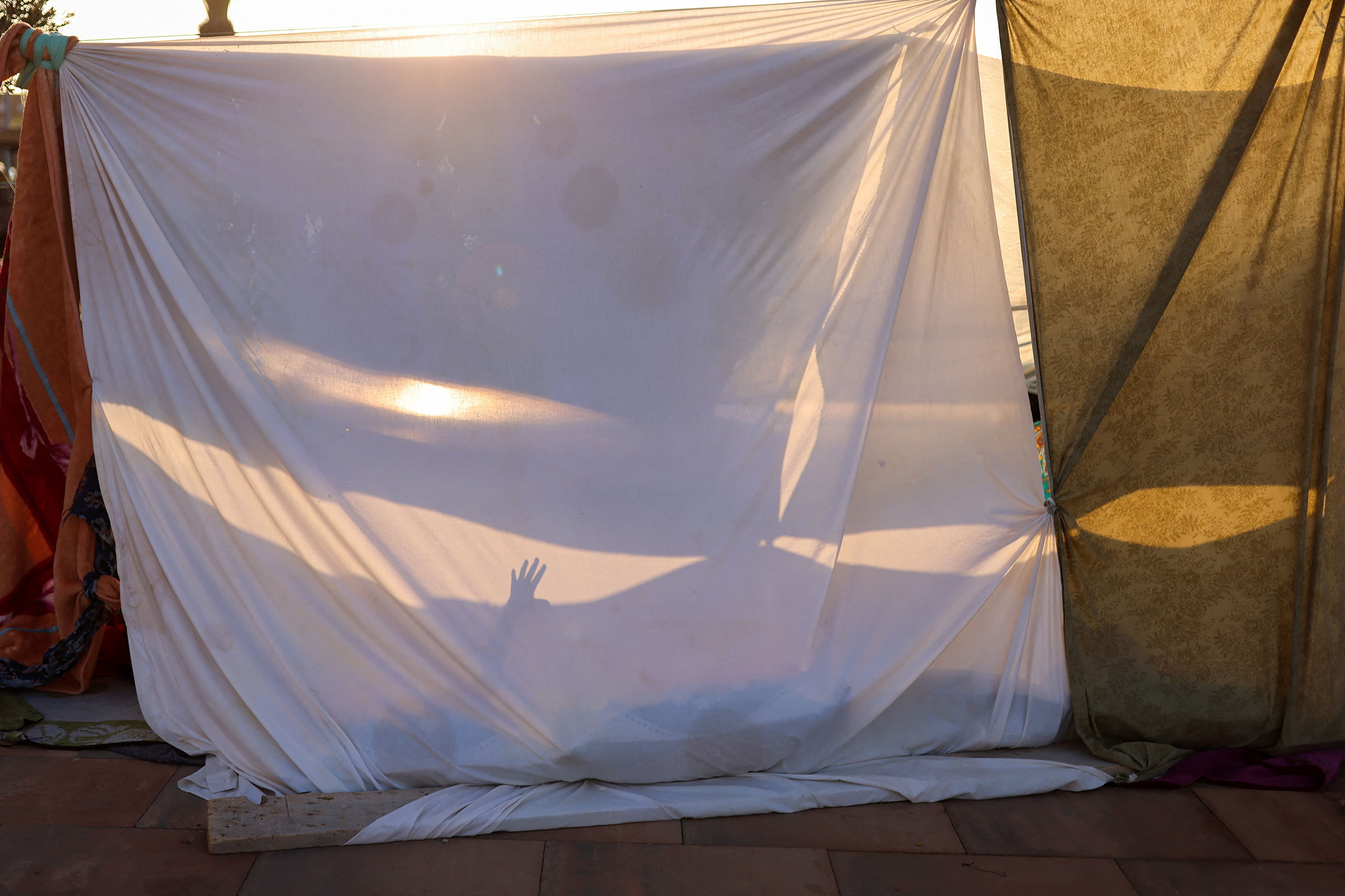 A resident rests in a makeshift shelter on a street next to a Gare Routiere, in the aftermath of a deadly earthquake, in Marrakech, Morocco, on Sept. 10.