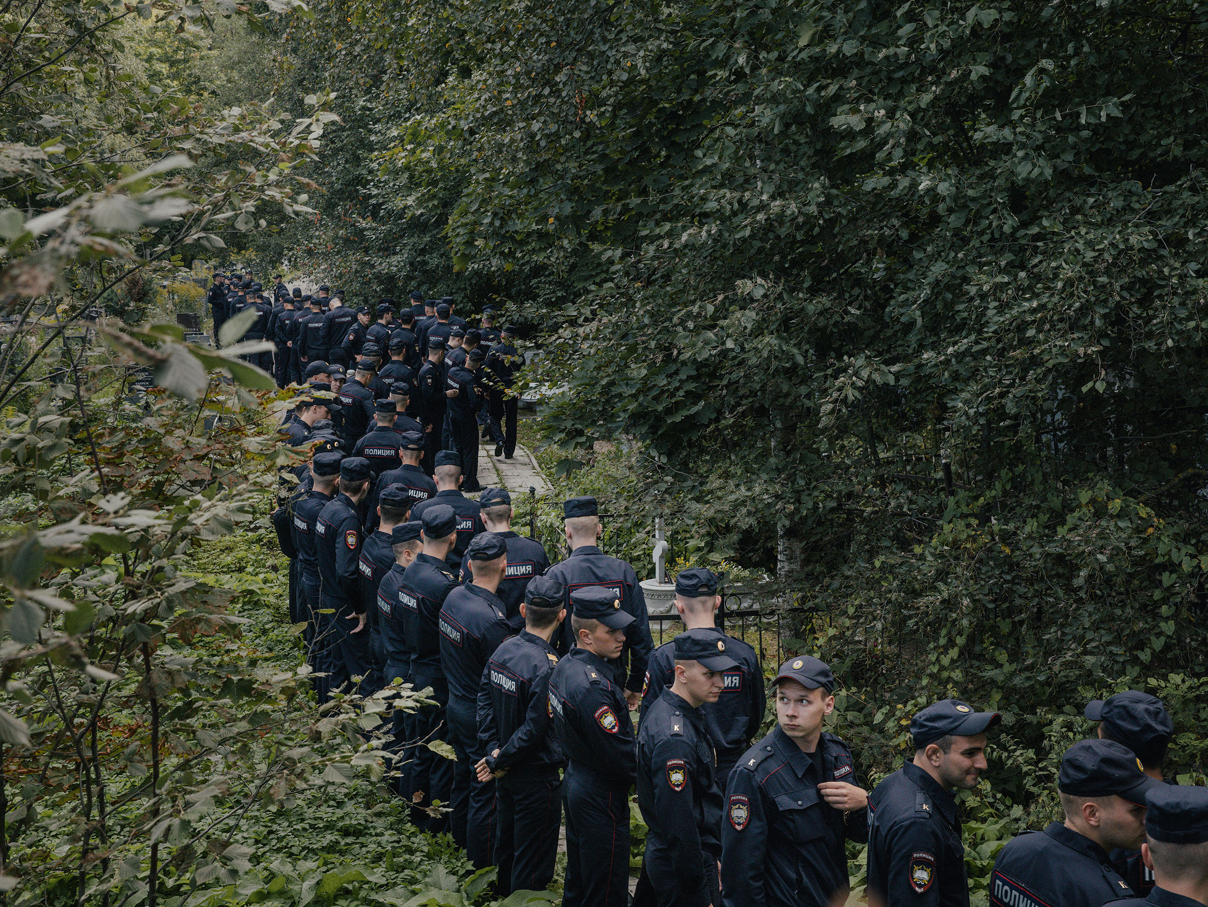 Police officers at the Porokhovskoye cemetery, where the press service owned by Yevgeny Prigozhin said he was buried, in St. Petersburg, Russia, on Aug. 29. The announcement of the burial of the Russian mercenary chief who died in a plane crash ended days of speculation over how he would be laid to rest.