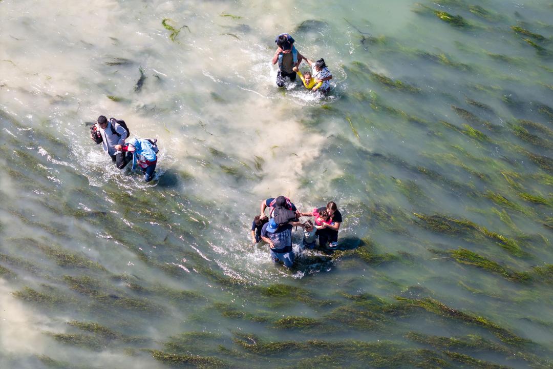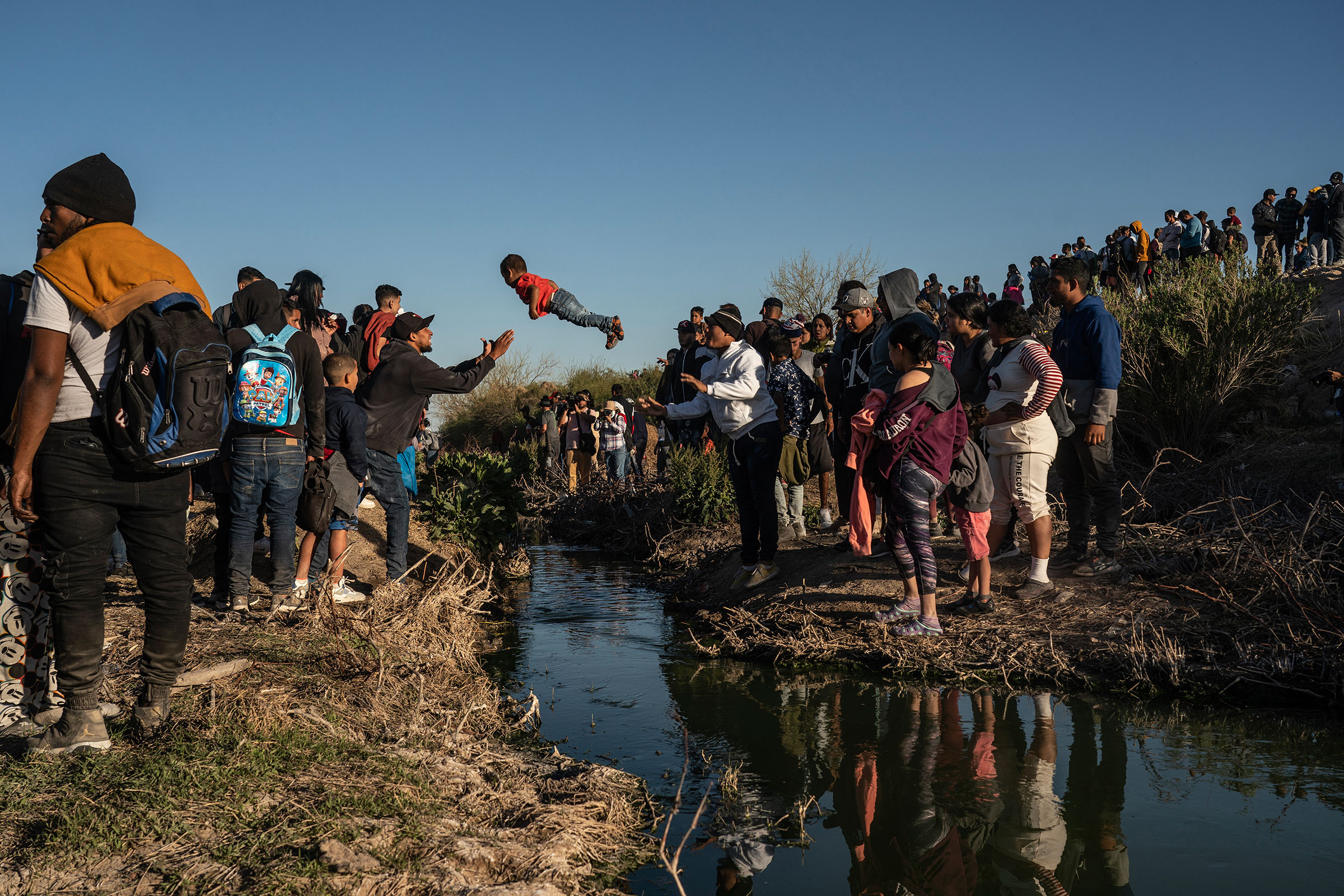 A child passes over a narrow stretch of the Rio Grande at the U.S. border with Mexico on March 29. Driven partly by a surge of Venezuelans seeking asylum, a record number of people migrated from South and Central America to the U.S., with arrivals reaching 2.5 million in the federal fiscal year that ended in October.