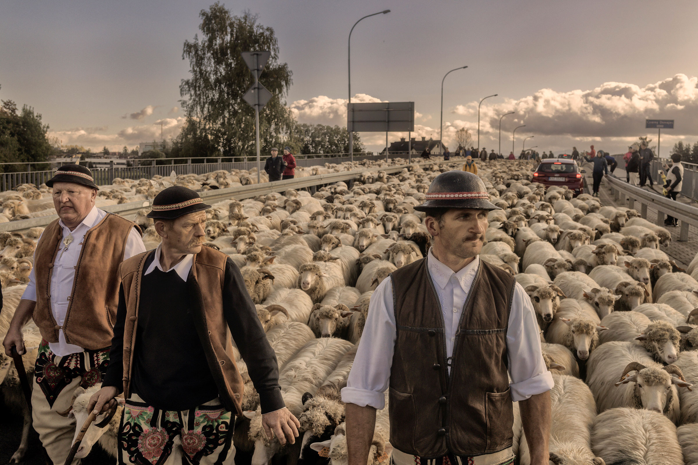 Shepherd Józef Klimowski, left, and others lead a flock of sheep in Nowy Targ, Poland, in the country's southern highlands, on Oct. 8.