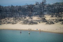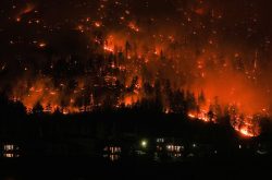 Flames encircle a mountainside above nearby homes as the McDougall Creek wildfire roared in West Kelowna, British Columbia, on Aug.Ê18. Extreme weather conditions fueled CanadaÕs worst wildfire season on record, with thousands of fires devastating millions of acres and darkening skies thousands of miles away.