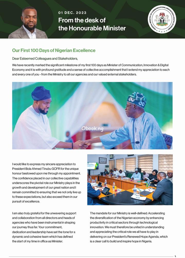 Minister of Communications, Innovations and Digital Economy, Bosun Tijani, on Tuesday, shared some of his strides within his first 100 days in office.