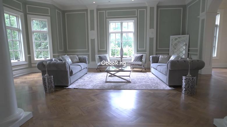 The house also boasts a six-car garage and private elevator access to all three floors. The house is set back from the road by tall, green trees and has cast-iron gates, a long driveway that leads to a vast car court.