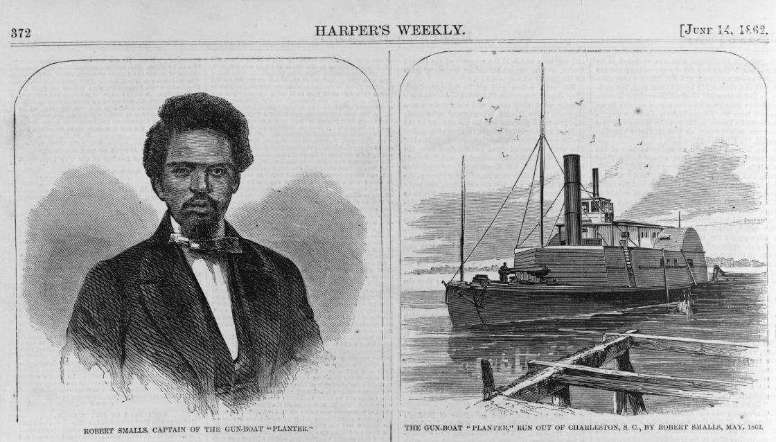After the war broke out, Robert was assigned to the Planter, a Confederate military cargo transport. Smalls piloted the Planter around Charleston harbor, gaining the confidence and trust of the black crew members and the three white officers. Knowing the crew trusted him, Smalls devised a plan of escape. One night when the officers left to sleep ashore, Smalls and the crew took the ship. Smalls piloted the ship out of the harbor and surrendered the Planter and its cargo to the Union navy. He also volunteered his knowledge of Charleston’s defenses, leading to the capture of Coles Island a week after his escape. Rear Admiral Samuel Francis DuPont wrote that Robert “is superior to any who have come into our lines — intelligent as many of them have been.”