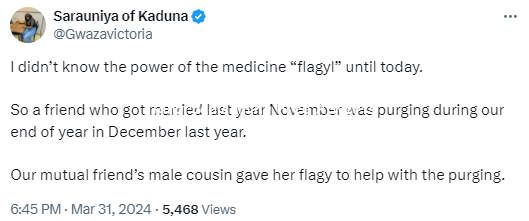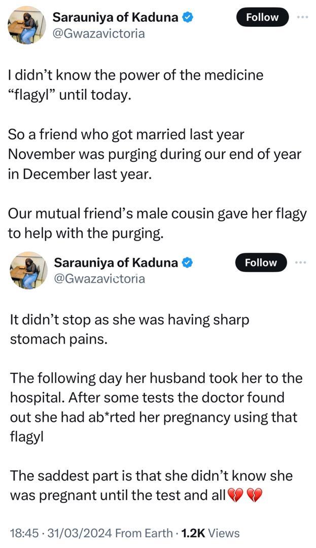 A Nigerian lady has taken to X to recount how a newly wedded bride took a drug that ended up terminating her first pregnancy. According to the X user, the newly married woman was having a running stomach and a friend offered her Flagyl. Sadly. she suffered serious pain and lost her baby. Read her post below The post Lady recounts how a newly wedded bride took a drug that ended up terminating her first pregnancy appeared first on Ringroad.com.ng Sell Buy Online For Free ! .