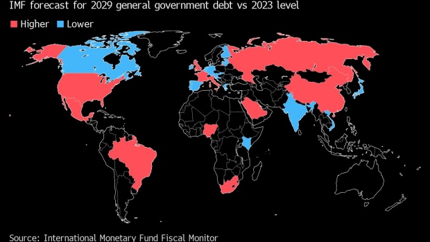 The Fund said both countries will lead a rise in global government debt to 98.8% of economic output in 2029 from 93.2% in 2023. The U.K. and Italy are among the other big contributors to that increase.