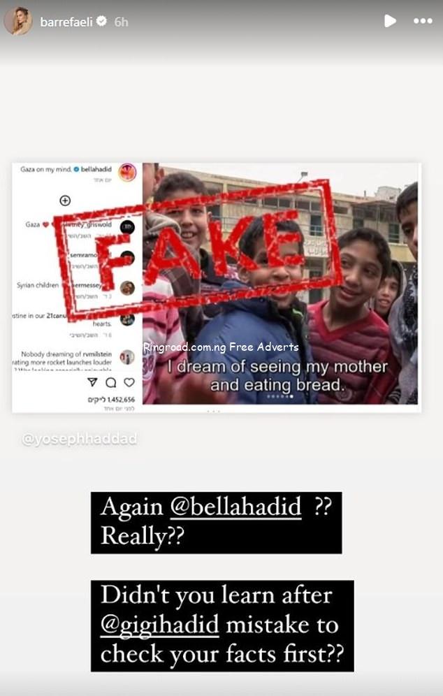 Israeli supermodel, Bar Refaeli has accused Bella Hadid of spreading fake news with a post showing Palestinian children. On Monday, Hadid, 27, shared an image of the children to her 60 million followers along with the caption: ‘Gaza on my mind.’ a reference to the continuing situation in the Palestinian territory currently under attack by Israel. However, the clip was originally from the Yarmouk refugee camp in Syria and came from a 2021 documentary directed by Bashar al-Assad during the Syrian civil war. Today, Refaeli took to her own Instagram to call out Hadid. She shared a screenshot of the model’s post with a red ‘fake news’ stamp over the top. ‘Didn’t you learn from your sister’s mistake?’ she wrote, likely in reference to Bella’s older sister Gigi Hadid’s own blunder in which she claimed Israel is ‘the only country in the world that keeps children as prisoners of war’.Gigi’s post accused Israel of the ‘abduction, rape, humiliation, torture, murder of Palestinians’ but the model, whose father is Palestinian and who last year likened Israelis to Nazis – apologised for her ‘mistake’, which she said was careless. ‘Taking innocent people as hostages is never okay,’ Hadid wrote at the time, adding: ‘Hurting someone because they are Jewish is never okay.’ At the time, Refaeli hit out at Gigi in the wake of her post. She shared other posts calling out Gigi, and also shared a video of a spokesperson for the Israel Defence Forces talking about the country’s Iron Dome defence system and the ongoing conflict with Hamas which was sparked by the October 7 terror attack. The post Israeli supermodel, Bar Refaeli accuses Bella Hadid of spreading fake news with photo of ‘starving Gaza child’ appeared first on Swordpress.com.ng.