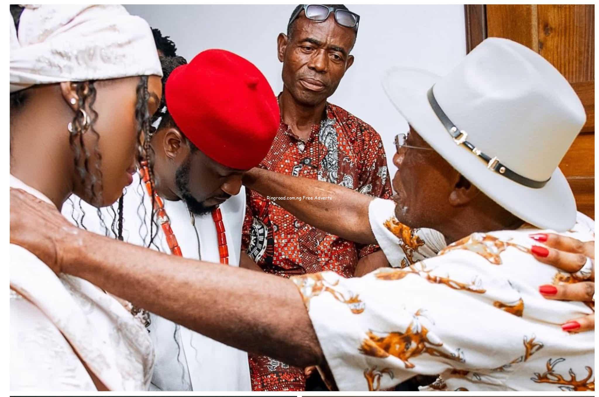 The pictures captured the newlyweds in traditional Igbo wedding attire, engaging in customary rites, including kneeling before their elders.