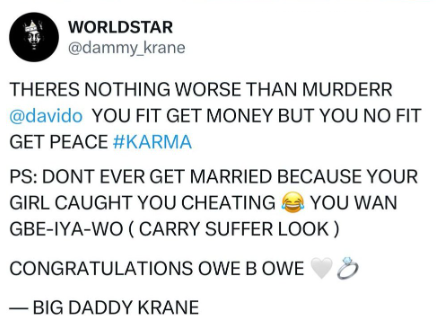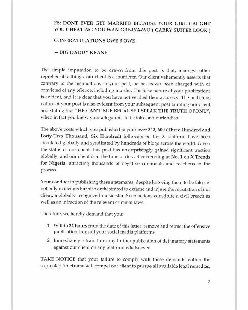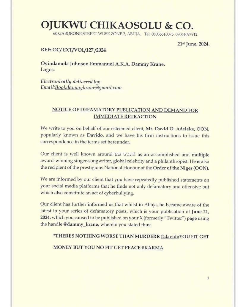 Davido has issued a cease and desist order to fellow singer Dammy Krane over a defamatory publication he made on social media. While reacting to Davido’s upcoming wedding on his social media account, Dammy alleged that Davido is getting married to Chioma simply because she caught him cheating. He also stated in the post that there is nothing worse than murder,” before adding that Davido might have money but he can never find peace. The Unavailable singer has now issued a cease and desist notice through his lawyers to Dammy Krane, asking Krane to refrain from making defamatory statements about him. The letter also demands that Dammy Krane remove and retract the offensive publication from all his social media accounts within 24 hours or risk being sued. The post Singer Davido issues cease and desist order to Dammy Krane over defamatory publication appeared first on www.adng.ng Get free adverts. An Ad search engine .