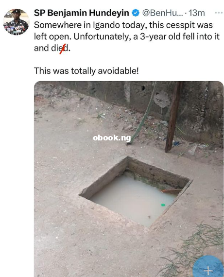 A three-year-old has died after falling into a cesspit. The spokesperson of the state police command, SP Benjamin Hundeyin, who disclosed this via his X handle, wrote;Somewhere in Igando today, this cesspit was left open. Unfortunately, a 3-year old fell into it and died. This was totally avoidable!”