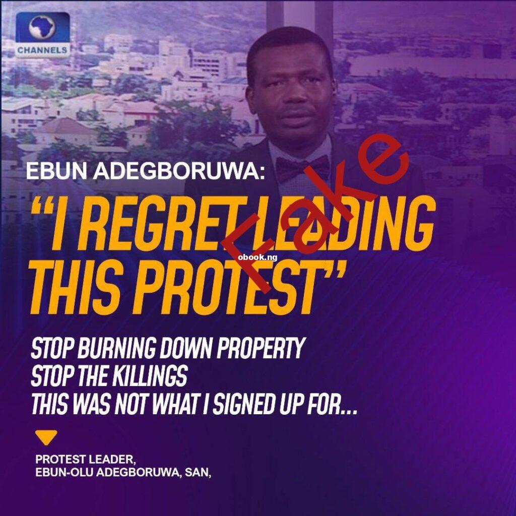 The image in question appears to be a screenshot from Channels TV with Adegboruwa’s photo and the alleged quote “STOP BURNING DOWN PROPERTY STOP THE KILLINGS THIS WAS NOT WHAT I SIGNED UP FOR… PROTEST LEADER, EBUN-OLU ADEGBORUWA, SAN.” However, Adegboruwa has firmly labeled this image as fake and doctored.