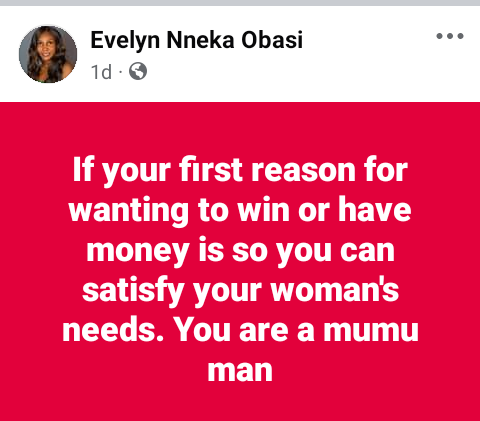 The post If your first reason for wanting to win or have money is so you can satisfy your woman’s needs. You are a mumu man – Nigerian lady says appeared first on Swordpress Blog .
