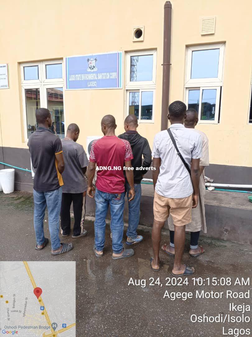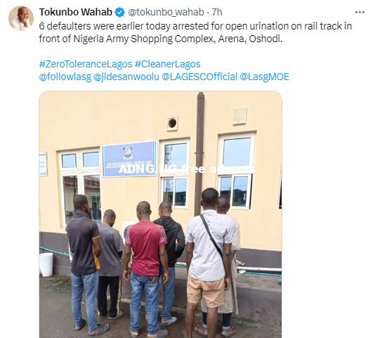 Six men were today August 24, arrested for urinating on rail tracks in the Oshodi area in Lagos state. The state Commissioner for Environment and Water Resources, Tokunboh Wahab, disclosed this on his X handle. He wrote;6 defaulters were earlier today arrested for open urination on rail track in front of Nigeria Army Shopping Complex, Arena, Oshodi.”