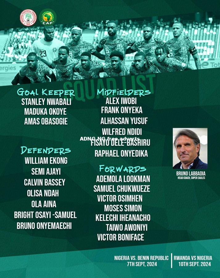 The Super Eagles of Nigeria have unveiled a strong squad for their upcoming 2025 Africa Cup of Nations (AFCON) qualifying matches against Benin Republic and Rwanda in a list published by the Nigeria Football Federation on Tuesday night, August 27.It will be the first game for the new coach, Bruno Labbadia, an Italian-German tactician.Captain William Troost-Ekong, wing-back Olaoluwa Aina, and forwards Victor Osimhen and Taiwo Awoniyi are among the key players making their return to the team after recovering from injuries.Troost-Ekong, who was named Man of the Competition at this years AFCON, missed Matchdays 3 and 4 of the 2026 FIFA World Cup qualifiers in June due to injury. Similarly, Aina, Awoniyi, and Africas reigning Player of the Year, Victor Osimhen, were also sidelined with injuries but are now back in action.The squad features a balanced mix of three goalkeepers, seven defenders, six midfielders, and seven forwards.AFCON 2023 star goalkeeper, Stanley Nwabali and Bendel Insurance goalkeeper Amas Obasogie have been included in the roster. South Africa-based defender Olisa Ndah also returns to the fold, along with Taiwo Awoniyi, who has been absent since the Super Eagles 1-1 draw with Lesotho in Uyo during the World Cup qualifiers last November. Nigeria will face the Cheetahs of Benin Republic at the Godswill Akpabio Stadium in Uyo on Saturday, 7th September. Following that, they will travel to Kigali to play against Rwandas Amavubi at the Amahoro Stadium on Tuesday, 10th September. All players are expected to report to the camp in Uyo by Monday, 2nd September. The post See full list of Nigeria’s squad for AFCON 2025 qualifiers against Benin Republic in Coach Bruno Labbadia’s first game appeared first on Swordpress Blog .