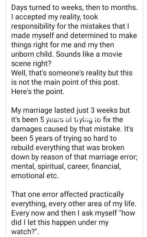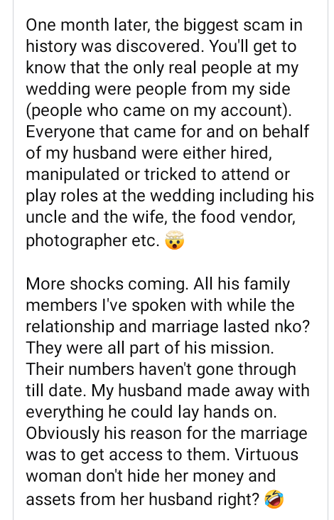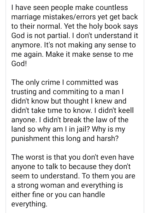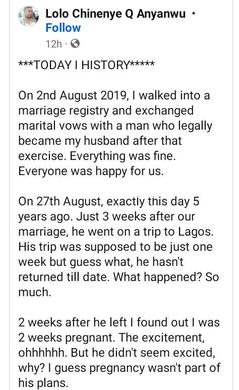 A Nigerian woman, Chinenye Anyanwu, has narrated how her newly wed bliss was cut short when her husband vanished into thin air three weeks after their court wedding in 2019. Chinenye, who shared her story in a Facebook post on Tuesday, August 27, 2024, said that her runaway husband, who is suspected to be a scammer, made away with everything he could lay hands on. According to her, Olumide left for Lagos on what was supposed to be a one week trip but never returned till date. She said two weeks into the trip, she informed Olumide that she was pregnant but he wasn’t thrilled about the idea of being a father. Unknown to her, she was in for more shock. In what she described as the biggest scam in history, she said it turned out that Olumide’s family members who came to the wedding weren’t real.” She alleged that they were either hired, tricked to attend or play roles at the wedding. On 2nd August 2019, I walked into a marriage registry and exchanged marital vows with a man who legally became my husband after that exercise. Everything was fine. Everyone was happy for us, she wrote. On 27th August, exactly this day 5 years ago. Just 3 weeks after our marriage, he went on a trip to Lagos. His trip was supposed to be just one week but guess what, he hasn’t returned till date. What happened? So much. 2 weeks after he left I found out I was 2 weeks pregnant. The excitement, ohhhhhh. But he didn’t seem excited, why? I guess pregnancy wasn’t part of his plans. One month later, the biggest scam in history was discovered. You’ll get to know that the only real people at my wedding were people from my side (people who came on my account). Everyone that came for and on behalf of my husband were either hired, manipulated or tricked to attend or play roles at the wedding including his uncle and the wife, the food vendor, photographer etc. More shocks coming. All his family members I’ve spoken with while the relationship and marriage lasted nko? They were all part of his mission. Their numbers haven’t gone through till date. My husband made away with everything he could lay hands on. Obviously his reason for the marriage was to get access to them. Virtuous woman don’t hide her money and assets from her husband right? Days turned to weeks, then to months. I accepted my reality, took responsibility for the mistakes that I made myself and determined to make things right for me and my then unborn child. Sounds like a movie scene right? Well, that’s someone’s reality but this is not the main point of this post. Here’s the point. My marriage lasted just 3 weeks but it’s been 5 years of trying to fix the damages caused by that mistake. It’s been 5 years of trying so hard to rebuild everything that was broken down by reason of that marriage error; mental, spiritual, career, financial, emotional etc. That one error affected practically everything, every other area of my life. Every now and then I ask myself “how did I let this happen under my watch?”. 1Everyone thinks you are strong and you are fine. But that’s not the whole truth. Few days ago my son woke up and saw me and said “Mummy you are crying again”. It broke me but I couldn’t help it. The last two months have been hell in my head, mind and body. I took stock of the past five years of my life and it seems God is punishing me for making one mistake. All my efforts to fix things, get back to my normal life in all aspects hasn’t yielded positive in my assessment. It’s like I get to 70% progress then back to 20%. It’s just not working. It’s more like a shadow than it’s real. It’s luike I don’t belong here anymore, like I am just fading away yet shining from the outer. For just one mistake? Isn’t this two much consequence? I have seen people make countless marriage mistakes/errors yet get back to their normal. Yet the holy book says God is not partial. I don’t understand it anymore. It’s not making any sense to me again. Make it make sense to me God! The only crime I committed was trusting and committing to a man I didn’t know but thought I knew and didn’t take time to know. I didn’t keell anyone. I didn’t break the law of the land so why am I in jail? Why is my punishment this long and harsh? The worst is that you don’t even have anyone to talk to because they don’t seem to understand. To them you are a strong woman and everything is either fine or you can handle everything. Olumide, I have never cursed you in the past five years and for a reason I’ll never do that. May the universe judge between you and I accordingly. Life indeed is not fair. Dear God, I think it is enough. It is. The post “The only crime I committed was trusting a man” – Nigerian woman narrates how her husband travelled to Lagos 3 weeks after their wedding and never returned appeared first on Swordpress Blog .