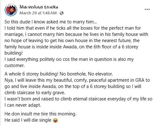 A Nigerian woman and baker, Marvellous Emeka, has narrated how a man cursed her after she turned down his marriage proposal because he lived in his family house, located on the 6th floor of a 6 storey building. So this dude I know asked me to marry him. I told him that even if he ticks all the boxes for the perfect man for marriage, I cannot marry him because he lives in his family house with no hope of leaving to get his own house in the nearest future, the family house is inside inside Awada, on the 6th floor of a 6 storey building, she narrated in a Facebook post at the weekend. I said everything politely oo cos the man in question is also my customer. The post He said I will d!e single – Nigerian woman narrates how a man reacted after she turned down his marriage proposal appeared first on searchng.ng by Dotiifi Digital www.dotifi.com.