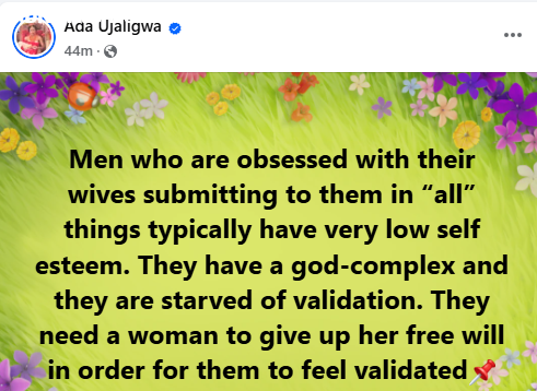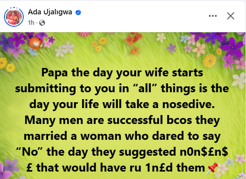 A Nigerian doctor, Ada Ujaligwa, has addressed men who are obsessed with their wives submitting to them. “Papa the day your wife starts submitting to you in all things is the day your life will take a nosedive. Many men are successful bcos they married a woman who dared to say No the day they suggested n0n$n$ that would have ru 1nd them,” she wrote in a Facebook post on Monday.    The post The day your wife starts submitting to you in all things is the day your life will take a nosedive – Nigerian doctor tells men appeared first on searchng.ng by Dotiifi Digital www.dotifi.com.