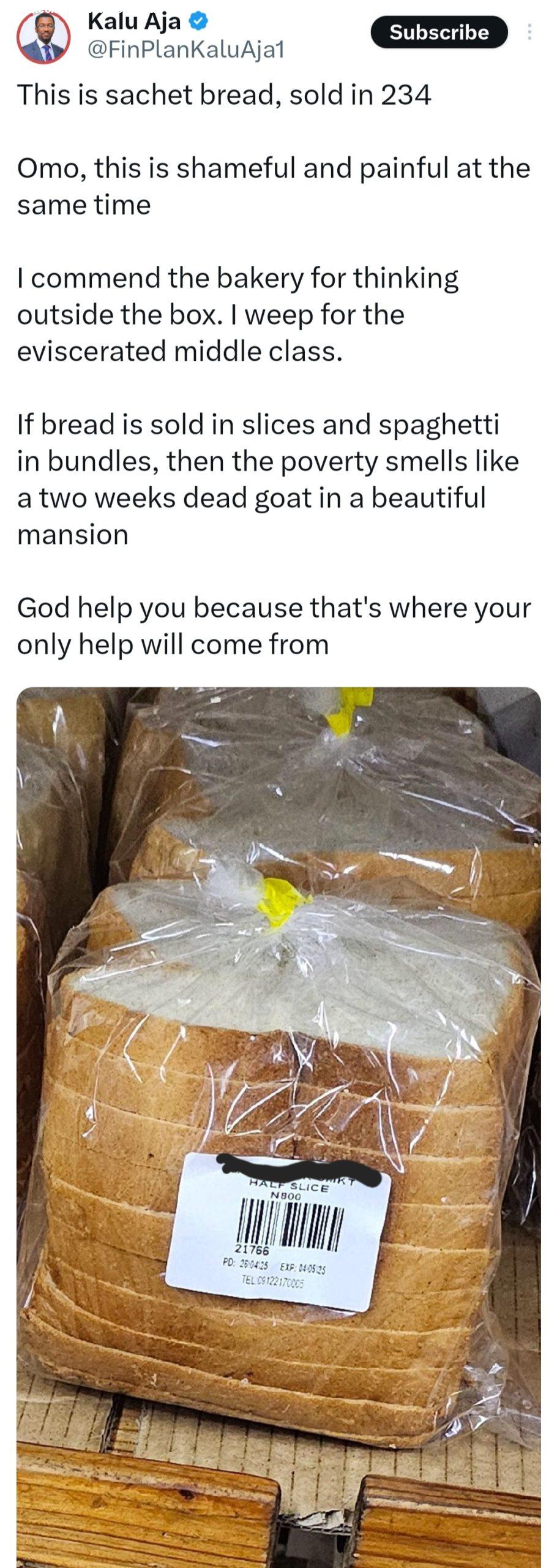 Financial instructor, Kalu Aja has expressed concern over the economic hardship in Nigeria after seeing loaves of breads being sold in halves in a store to allow poor consumers buy. He shared a photo showing half a loaf of sliced bread on the shelf in the store. He called it “shameful and painful” as he addressed the poverty in Nigeria. He wrote on X: “This is sachet bread, sold in 234. “Omo, this is shameful and painful at the same time “I commend the bakery for thinking outside the box. I weep for the eviscerated middle class. “If bread is sold in slices and spaghetti in bundles, then the poverty smells like a two weeks dead goat in a beautiful mansion “God help you because that’s where your only help will come from.” The post “This is shameful” Financial instructor says after seeing “half slice” of bread being sold in supermarket due to economic hardship appeared first on searchng.ng by Dotiifi Digital www.dotifi.com.