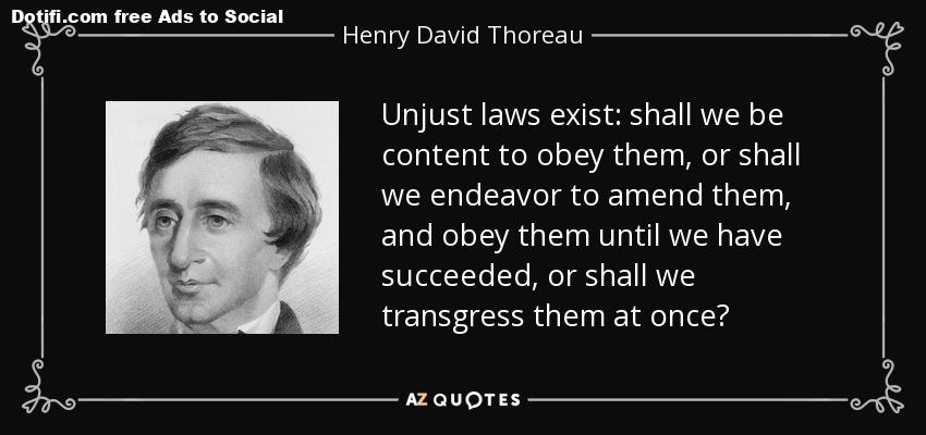 “Unjust laws exist: shall we be content to obey them, shall we endeavor to amend them and obey them until we succeed, or shall we transgress them at once?”