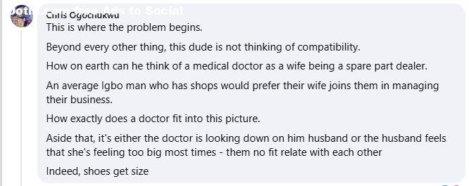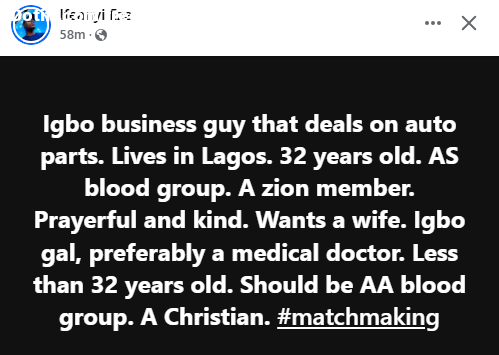 A Nigerian auto spare parts dealer is seeking a medical doctor to marry. A US-based PhD student, Ifeanyi Eze, who is playing the matchmaker, shared this in a Facebook post on Friday, May 9.  “Igbo business guy that deals in auto parts. Lives in Lagos. 32 years old. AS blood group. A Zion member. Prayerful and kind. Wants a wife. Igbo gal, preferably a medical doctor. Less than 32 years old. Should be AA blood group. A Christian,” he wrote.   The post has raised eyebrows, with many people questioning an auto spare parts dealer’s preference for a medical doctor as a wife.   However, Ifeanyi defended the man’s choice of a medical doctor, saying that he has a right to his preference. Any man who go and marry anyhow woman is a big fool. Marry for love, finance and power. Thats what women do. They protest when men try the same. But not for men like me. Marriage is a financial and generational decision. You guys should learn, he added.   The post Nigerian auto spare parts dealer seeks a prayerful and kind medical doctor to marry appeared first on Time.com.ng.
