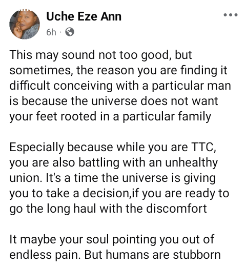A Nigerian woman, Uche Eze Ann has said that when a woman finds it difficult to conceive with a particular man, it might be because she is in an unhealthy union or the universe doesn’t want them to be part of his family.  This may sound not too good, but sometimes, the reason you are finding it difficult conceiving with a particular man is because the universe does not want your feet rooted in a particular family, she wrote in a Facebook post on Sunday. “Especially because while you are TTC, you are also battling with an unhealthy union. It’s a time the universe is giving you to take a decision,if you are ready to go the long haul with the discomfort. It maybe your soul pointing you out of endless pain. But humans are stubborn.   The post The reason you are finding it difficult conceiving with a particular man is because the universe doesn’t want your feet rooted in his family – Nigerian woman says appeared first on Time.com.ng.
