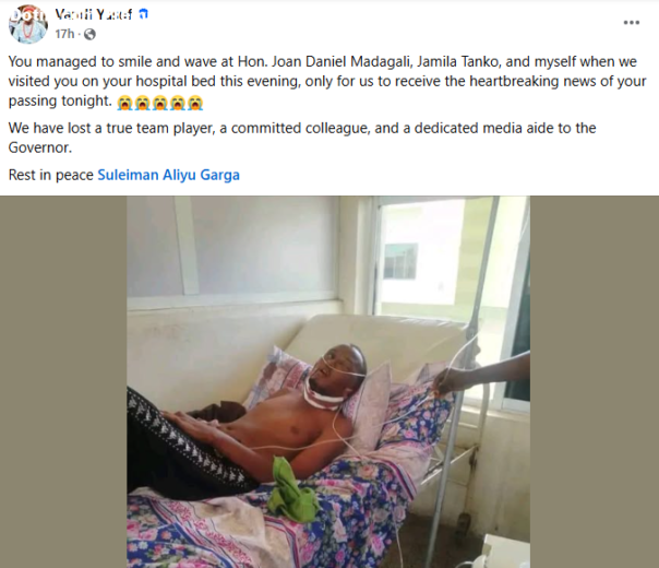 Suleiman Aliyu Garga, a Special Assistant on Content Creation to the Governor of Adamawa State, Ahmadu Umaru Fintiri, has passed away three days after he complained of acute toothache. Garga took to Facebook on Thursday, July 17, 2025, urging people to pray to God against toothache. You should pray to God to save you from toothache even if it is for 1 minute Alaji. Allah is sufficient for us and He is the best disposer of affairs, he wrote. Garga was admitted at the Modibbo Adama University Teaching Hospital where he underwent a surgery. It was gathered that the surgery site started bleeding and he passed away on Saturday, July 20, 24 hours after the procedure. Garga was laid to rest at the Yolde Pate Muslim Cemetery in Yola on Sunday morning, July 20. The burial followed the Sallah Rakaat prayers held at the Modibbo Zailani Mosque, Yola Town, in accordance with Islamic rites. The post Governor Fintiri’s aide d!es three days after complaining of toothache appeared first on Time.com.ng.