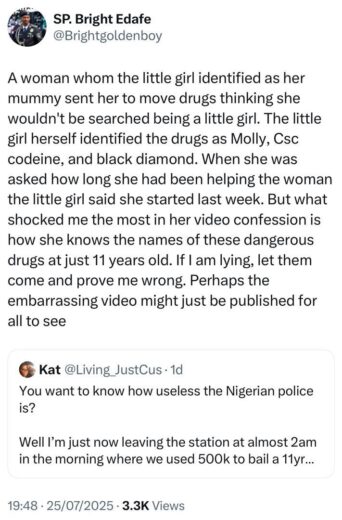 The spokesperson of the Delta state police command, SP Bright Edafe, has said that preliminary investigation shows that the 11-year-old girl arrested and later bailed with N500, 000 at the Ekpan Police division , was being used to traffic hard drugs. LIB had earlier shared the story of an X user crying for justice after the minor was apprehended with some suspected drug traffickers while commuting in a tricycle in the Ekpan area of the state on Thursday, July 24. Read here. The story received wide reactions with many Nigerians condemning the police for arresting a minor. The state police command then asked the young girl and her family to come to the police for an investigation to be carried out and their money refunded to them. In a reaction shared on his X handle this evening, Edafe stated that the young girl upon interrogation claimed that her guardian sent her to pick up the hard drugs. He also mentioned that there is a video of the victim saying that she started picking up drugs for trafficking for her guardian last week and also gave the names of all the drugs apprehended in the tricycle. LIB gathered that the minor’s mother is late and that she has been living with the guardian who the police says recently introduced her to drug trafficking. According to police sources, the guardian believed that policemen would not think of searching a minor so preferred to use her to traffic the banned substance. Edafe’s update readsA woman whom the little girl identified as her mummy sent her to move drugs thinking she wouldn’t be searched being a little girl. The little girl herself identified the drugs as Molly, Csc codeine, and black diamond. When she was asked how long she had been helping the woman the little girl said she started last week. But what shocked me the most in her video confession is how she knows the names of these dangerous drugs at just 11 years old. If I am lying, let them come and prove me wrong. Perhaps the embarrassing video might just be published for all to see”The post Update: 11-year-old arrested in Delta was used to traffick drugs- Delta police command PRO says, threatens to release video of the minor identifying the hard drugs appeared first on Time.com.ng.