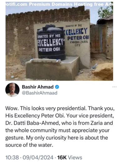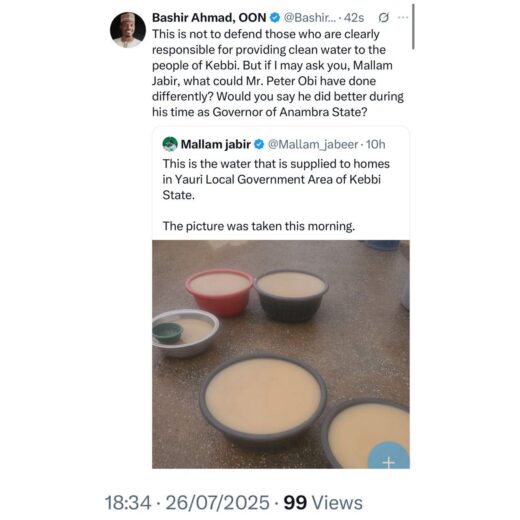 Former presidential aide, Bashir Ahmad, tackled a staunch supporter of Peter Obi, Mallam Jabeer, who complained about the dirty water supplied to homes in Kebbi. Jabeer had shared a photo of buckets of dirty water and claimed they were supplied to home this morning July 26. Ahmad who is a staunch APC member reacted to Jabeer’s post, asking what Obi could possibly do differently to better the lives of the people in the community. He went on to ask Jabeer how Obi faired when he served as governor of Anambra state. See the exchange belowThe post What could Peter Obi have done differently? – Former presidential aide, Bashir Ahmad, asks Obis staunch supporter who complained about the dirty water supplied to homes in Kebbi appeared first on Time.com.ng.