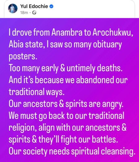 Actor Yul Edochie has raised alarm over the high number of early and untimely de@ths in Nigeria. According to him, he recently travelled from Anambra to Abia state and was taken aback by the number obituaries he saw of young people. He attributed the early de@ths to the ancestors and spirits being angry because many have abandoned traditional ways of worship. He said the society needs spiritual cleansing and every African needs to return to traditional religion. The post ”Too many early and untimely de@ths. Its because we abandoned our traditional ways. Our ancestors and spirits are angry”- actor Yul Edochie appeared first on Time.com.ng.