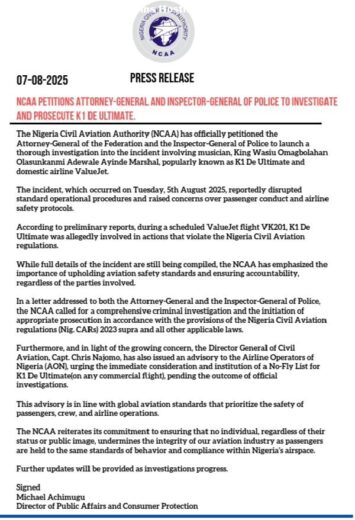 The Nigeria Civil Aviation Authority (NCAA) has officially petitioned the Attorney-General of the Federation and the Inspector-General of Police to launch a thorough investigation into the incident involving musician, King Wasiu Omagbolahan Olasunkanmi Adewale Ayinde Marshal, popularly known as K1 De Ultimate and domestic airline ValueJet.