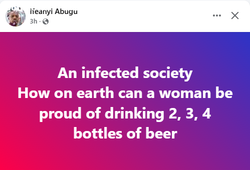 A Nigerian man, Ifeanyi Abugu has lamented over the moral decadence in the society because some women drink between one to four bottles of beer. An infected society. How on earth can a woman be proud of drinking 2, 3, 4 bottles of beer, he wrote in a Facebook post on Thursday.