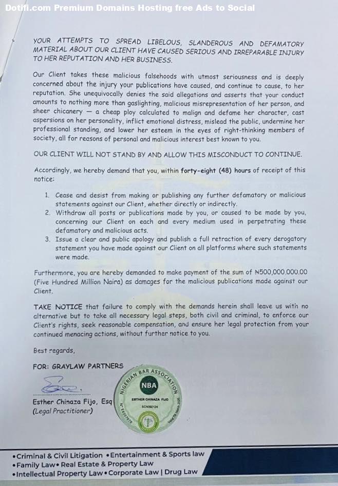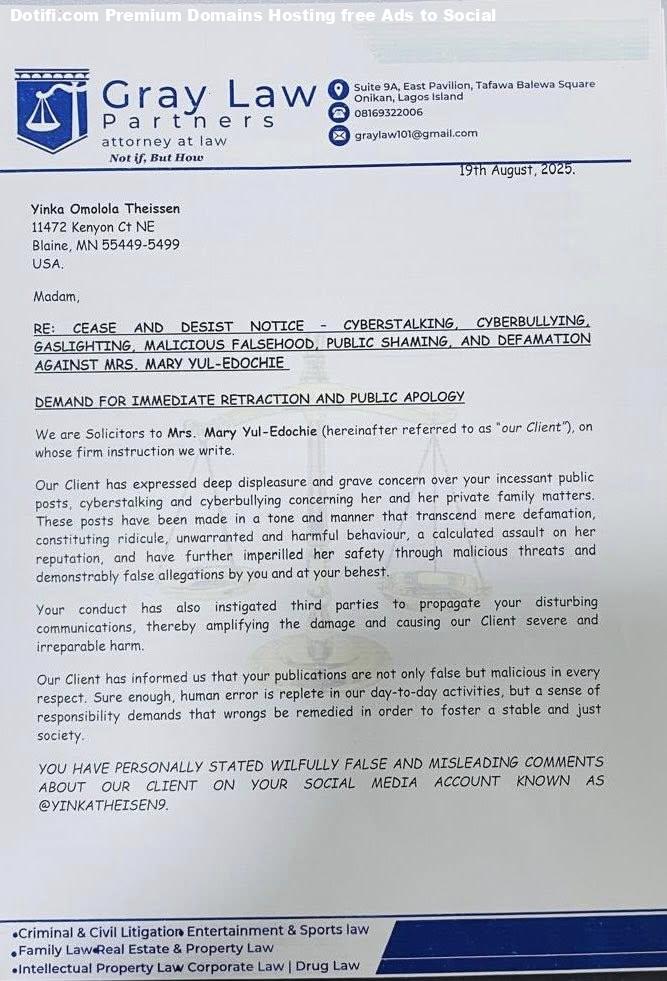 May Yul-Edochie, the estranged wife of actor, Yul Edochie, has sent a cease and desist letter to Linc Edochie’s ex-lover, Yinka Theisen, for allegedly cyberstalking, cyberb#llying her and for defaming her person online. In a letter released by her legal representative, Graylaw Partners, May accused Yinka of making posts that Cyberstalk and cyberbully her by posting falsehood against her on his social media platforms. She stated that Yinkas posts have been made in a tone and manner that transcend mere defamation, constituting ridicule, unwarranted and harmful behaviour, a calculated assault on her reputation, and have further imperilled her safety through malicious threats and demonstrably false allegations by you and at your behest. She went further to state that Yinka’s posts also instigated third parties to propagate your disturbing communications. thereby amplifying the damage and causing our Client severe and irreparable harm. She demanded that she stopped making such publications, retract existing posts, issue a public apology, and publish a retraction on all her platforms. She is also seeking financial compensation of N500 million in damages. See the letter below The post May Yul-Edochie sends cease and desist letter to Linc Edochie’s ex-lover, Yinka Theisen; demands N500m in damages over alleged cyberbullying and online defamation appeared first on Time.com.ng.