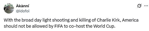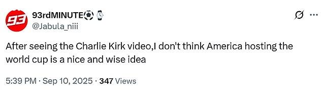 Football fans have called for the United States to be stripped of its World Cup hosting duties next summer after  conservative activist and influential Donald Trump ally, Charlie Kirk, was sh0t de@d. Kirk, 31, was hosting an event at Utah Valley University on Wednesday, September 10, when he was sh0t in the neck while speaking onstage. He was rushed to a local hospital as doctors tried to save him, but President Trump later announced that the influential MAGA commentator had passed away. With the World Cup set to kick off next summer, many soccer fans expressed concern at the tournament going ahead in America. ‘With the broad day light shooting and killing of Charlie Kirk, America should not be allowed by FIFA to co-host the World Cup,’ one fan wrote on X. ‘How will the World Cup be held in an unsafe country after the scenes of Charlie Kirk’s murder?,’ a second asked. ‘The World Cup cannot go ahead in America, for everyone’s safety,’ a third added. A fourth said: ‘After seeing the Charlie Kirk video, I don’t think America hosting the world cup is a nice and wise idea,’ While the 2026 World Cup will see games staged in Mexico, Canada, and the USA, the vast majority of the games will be held in the United States. Of the 16 host cities, 11 are in the United States, while all of the games from the quarterfinals onward will be in the USA. The final will be held at MetLife Stadium in East Rutherford, New Jersey. Kirk was a close ally of President Trump, who honored the Turning Point USA founder following his de@th. ‘The Great, and even Legendary, Charlie Kirk, is dead,’ Trump wrote on his Truth Social platform. ‘No one understood or had the Heart of the Youth in the United States of America better than Charlie. He was loved and admired by ALL, especially me, and now, he is no longer with us. Melania and my Sympathies go out to his beautiful wife Erika, and family. Charlie, we love you!’ The post Football fans call for USA to be stripped of World Cup hosting duties after Charlie Kirk was sh0t de@d appeared first on Time.com.ng.