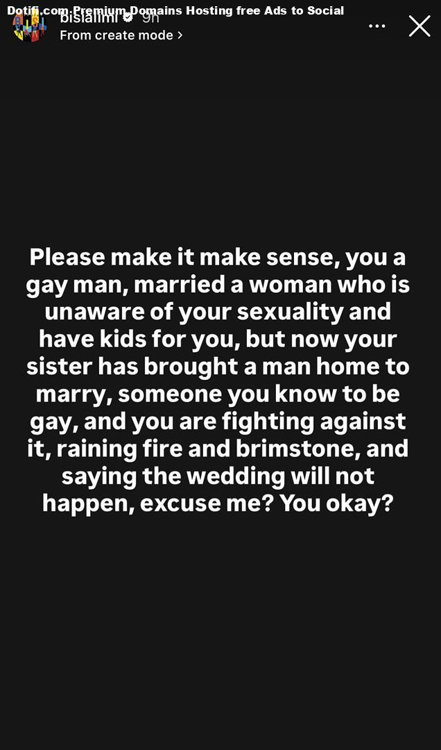 Bisi Alimi has taken to social media to react to a recent incident involving a gay man. According to him, a certain gay man intentionally married a woman who was oblivious of his sexual orientation and had children by him. Now, the same man’s sister is about to marry a gay man who is certainly downlow to her. According to Bisi, this same gay man is kicking against the wedding, saying it must not hold. Bisi in his post asked if the man is okay as he is not any different from the intending groom. Read his post below The post Bisi Alimi knocks gay man who is married to a woman and has fathered children but is against his sister getting married to a gay man appeared first on Time.com.ng.