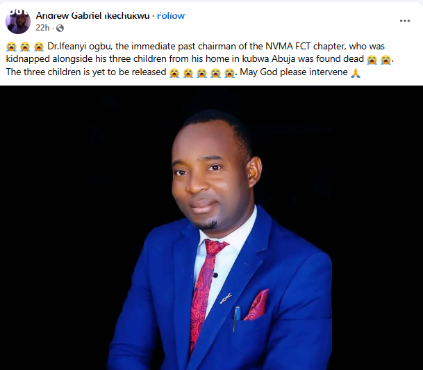 Suspected kidnappers have k!lled an Abuja-based veterinary doctor and former chairman of the Nigerian Veterinary Medical Association, FCT Chapter, Dr Ifeanyi Ogbu and abducted his three children. According to reports, the gunmen stormed the residence of the deceased located in Kubwa district along the Kubwa-Kaduna road on Friday night, October 3, killing him, dumping his body by the roadside and then whisked his three kids away. Dr Ogbus d3ath was confirmed on social media by his friend, Andrew Gabriel Ikechukwu, who wrote;Dr. Ifeanyi Ogbu, the immediate past chairman of the NVMA FCT chapter, who was kidnapped alongside his three children from his home in Kubwa Abuja, was found dead. The three children are yet to be released. May God please intervene. The attack comes barely a week after an ARise TV reporter, Somtochukwu Maduagwu, d!ed during a robbery in Katampe, another area of Abuja. The FCT police command is yet to comment on the recent development. The post Gunmen kill Veterinary doctor in Abuja, kidnap his 3 children appeared first on Time.com.ng.