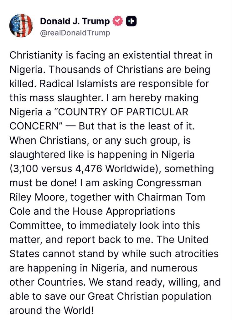 US President Donald Trumps administration has redesignated Nigeria as a country of particular concern over reports of genocide against Christians. In a statement issued on social Media, on Friday, October 31, Trump said Christianity was facing an existential threat in Nigeria.Christianity is facing an existential threat in Nigeria. Thousands of Christians are being killed. Radical Islamists are responsible for this mass slaughter. I am hereby making Nigeria a COUNTRY OF PARTICULAR CONCERN But that is the least of it. When Christians, or any such group, is slaughtered like is happening in Nigeria (3,100 versus 4,476 Worldwide), something must be done!I am asking Congressman Riley Moore, together with Chairman Tom Cole and the House Appropriations Committee, to immediately look into this matter, and report back to me.’The United States cannot stand by while such atrocities are happening in Nigeria, and numerous other Countries. We stand ready, willing, and able to save our Great Christian population around the World!US Senator Ted Cruz recently made the claim of a Christian genocide in Nigeria, a claim that has refuted by the Federal government and some Religious leaders.Senator Ted Cruz alleged that Nigeria is experiencing a “Christian genocide,” claiming that Christians are being targeted and executed for their faith by Islamist terrorist groups. The post Trump redesignates Nigeria as Country of particular concern over Christian Genocide claims appeared first on Time.com.ng.