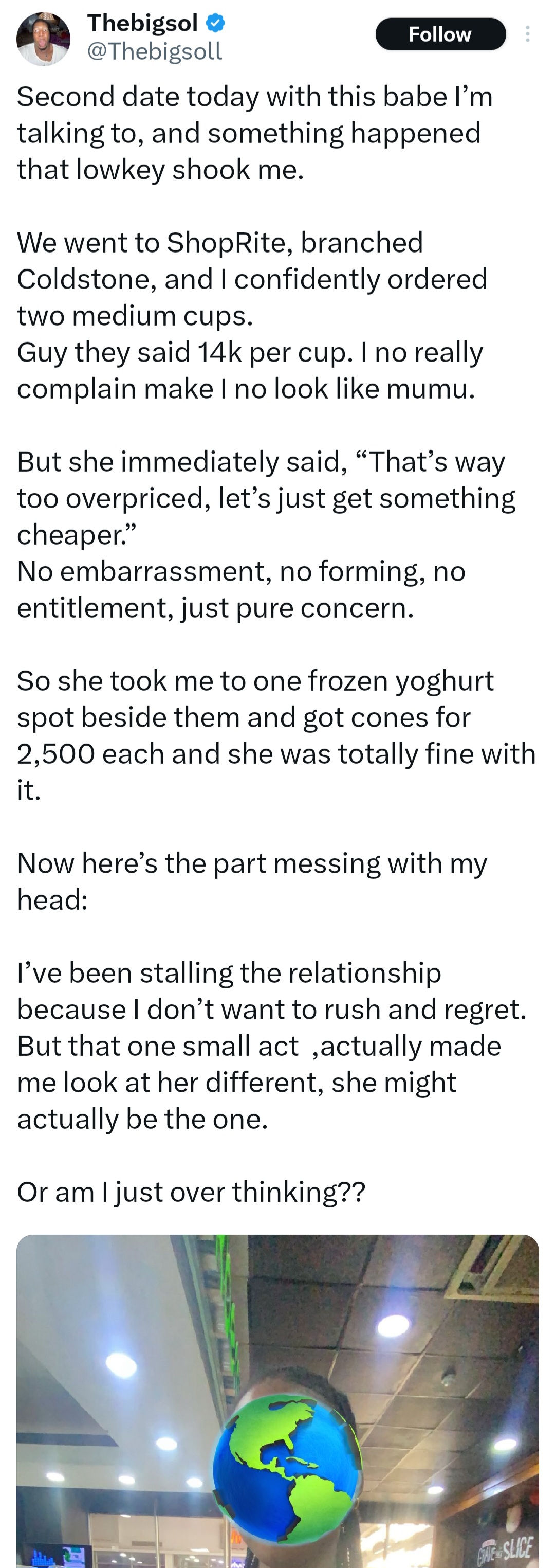 A man has revealed how a woman changed his feelings towards her with just one act she exhibited while they were on a date. He explained that it was their second date and his plan was to take his time in the relationship to avoid rushing. However, he said the singular act she exhibited makes him believe she might be the one. He wrote: “Second date today with this babe Im talking to, and something happened that lowkey shook me. “We went to ShopRite, branched Coldstone, and I confidently ordered two medium cups. Guy they said 14k per cup. I no really complain make I no look like mumu. “But she immediately said, Thats way too overpriced, lets just get something cheaper. “No embarrassment, no forming, no entitlement, just pure concern. “So she took me to one frozen yoghurt spot beside them and got cones for 2,500 each and she was totally fine with it. Now heres the part messing with my head: Ive been stalling the relationship because I dont want to rush and regret. But that one small act actually made me look at her different, she might actually be the one. Or am I just over thinking?? The post Man reveals act woman exhibited during date that made him “look at her different” appeared first on Time.com.ng.