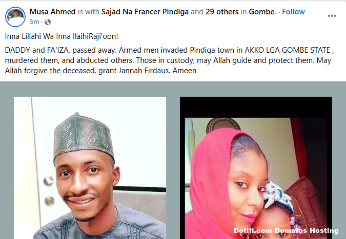 Suspected bandits have k!lled a prince and his seven months pregnant sister in Pindiga town, Akko Local Government Area of Gombe State. It was gathered that the assailants stormed a private home in the early hours of Saturday, December 27, 2025, k!lled Prince Yusuf Derdoski, popularly known as Daddy, his sister, Faiza, and abducted four other members of the family. The attack has plunged the town into deep mourning and shock. The Gombe State Governor, Muhammadu Inuwa Yahaya, has condemned in strongest terms the murder and abduction, describing it as barbaric, cruel and unacceptable. The statement issued by Ismaila Uba Misilli, the Director-General of Press Affairs, Government House, said security agencies have begun a manhunt for the perpetrators. The Governor said the k!lling of innocent citizens in their homes, alongside the abduction of women and children, is a heinous crime that deeply offends humanity and challenges the peace and security Gombe State has worked hard to sustain, the statement read. “This dastardly act is a direct assault on our collective conscience and a painful test of our resolve to protect lives and property. The Government and people of Gombe State share in the grief and anguish of the affected families and the entire Pindiga community. “He assured that the crime will not go unchecked, disclosing that the Nigeria Police and other security agencies have commenced intensive investigations into the killings and abductions. “The Governor directed that all necessary resources be deployed to track down the perpetrators, rescue the abducted victims unharmed, and bring all those involved to justice. “Reiterating his administrations firm commitment to security, Governor Inuwa Yahaya warned criminals and their collaborators that Gombe State will not serve as a haven for them. “He added that security operations will be intensified, intelligence gathering strengthened and collaboration with communities deepened. “The Governor urged residents to remain calm, vigilant and cooperative with security agencies, assuring the people of Pindiga and the entire state that the government stands firmly with them and will take decisive measures to ensure peace and safety. He extended his heartfelt condolences to the families of the deceased and the Pindiga Emirate, and prayed that Almighty Allah grants them strength and fortitude to bear the immense loss. He also prayed for the safe and speedy rescue of those abducted. The post Suspected bandits k!ll prince and his pregnant sister, abduct others in Gombe appeared first on Time.com.ng.