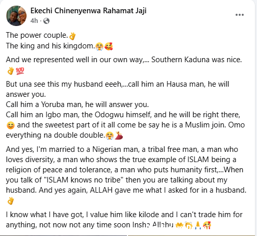 A Nigerian woman, Ekechi Rahamat Chinenyenwa Jaji, who converted to Islam, has hailed her Muslim husband, Barrister Muhammad Jaji, describing him as a detribalised Nigerian. Ekechi, from Enugu State, married Jaji, from Plateau State, in 2025. According to her, Muhammad is a true example of Islam being a religion of peace and tolerance. Sharing their photos from a visit to Southern Kaduna, Ekechi reiterated her love for Muhammad, saying she won’t trade him for for anything “The power couple. The king and his kingdom. And we represented well in our own way,… Southern Kaduna was nice. But una see this my husband eeeh,…call him an Hausa man, he will answer you. Call him a Yoruba man, he will answer you,” she wrote. “Call him an Igbo man, the Odogwu himself, and he will be right there, and the sweetest part of it all come be say he is a Muslim join. Omo everything na double double. “And yes, I’m married to a Nigerian man, a tribal free man, a man who loves diversity, a man who shows the true example of ISLAM being a religion of peace and tolerance, a man who puts humanity first,…When you talk of “ISLAM knows no tribe” then you are talking about my husband. And yes again, ALLAH gave me what I asked for in a husband. I know what I have got, I value him like kilode and I can’t trade him for anything, not now not any time soon Insha Allahu. The post He shows the true example of Islam being a religion of peace and tolerance – Igbo woman who converted to Islam hails her Muslim husband appeared first on Time.com.ng.