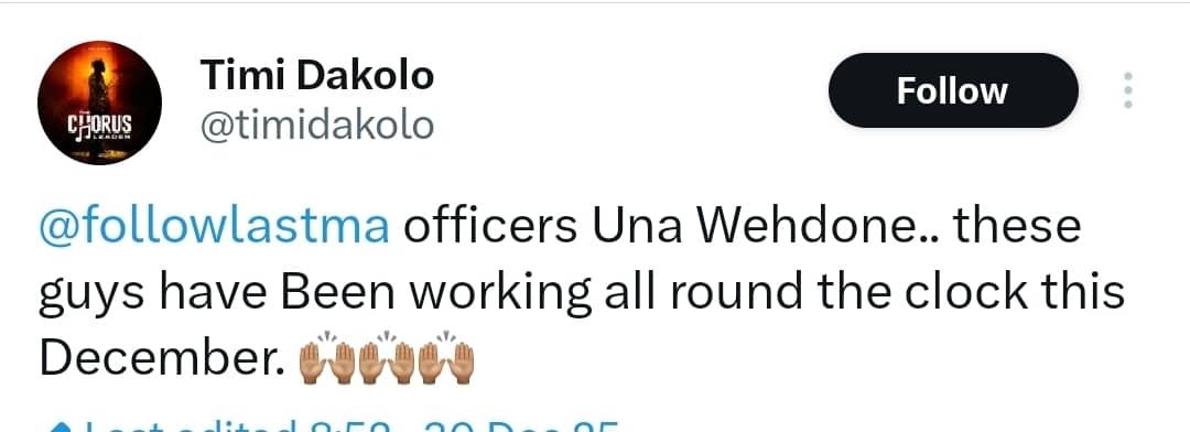 Singer Timi Dakolo has responded sharply to criticism after he publicly praised Lagos State Traffic Management Authority (LASTMA) officers for working tirelessly throughout the festive season. Dakolo had shared a post commending the officers, saying they had been working round the clock in December and deserved applause for their efforts. However, the praise did not sit well with one social media user, who dismissed it as unnecessary and likened it to clapping for a fish for swimming. Reacting to the comment, Dakolo fired back, telling the critic to keep quiet and questioning whether they understood what it meant to work round the clock. He added that people who do demanding jobs deserve to be applauded when they do well.The post Singer Timi Dakolo claps back after being criticised for praising LASTMA officers appeared first on Time.com.ng.