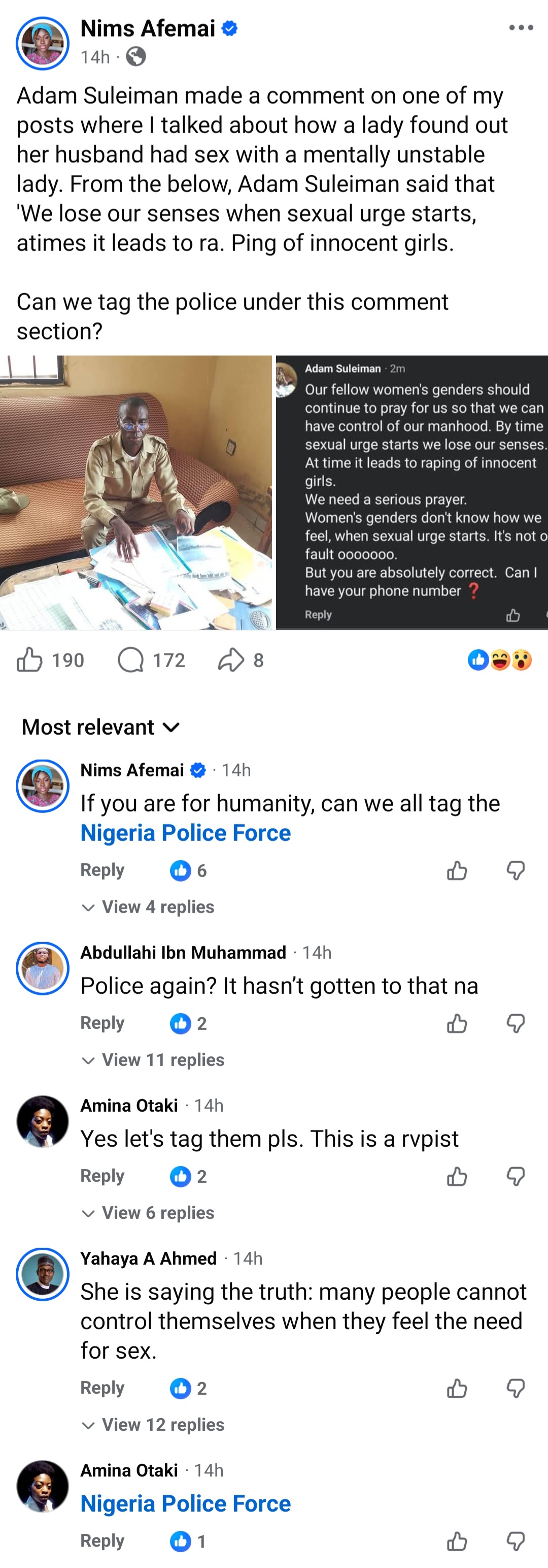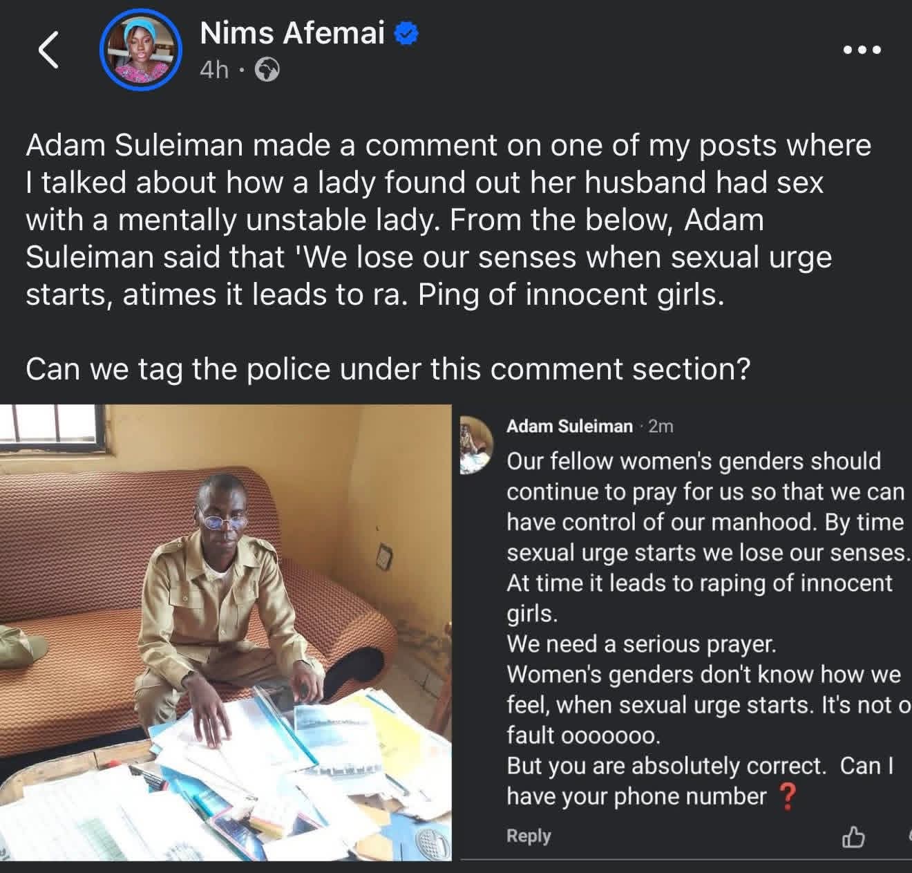 Nigerians on Facebook are tagging the police to go after a corps member whom they believe might not be safe to be around girls. Concern grew after the corps member stated that when “sxual urges start, we lose our senses. At times it leads to r@ping of innocent girls.” He added: “We need serious prayers. Women’s gender don’t know how we feel when sxual urges start.” His comment was in response to a married man who r@ped a woman who is mentally ubstable. While his comment got support from some men, others slammed him and began reporting him, asking the police to make sure he has no access to girls where he’s serving. The post Nigerians call attention of police to corps member who said he can’t control himself sxually appeared first on Time.com.ng.