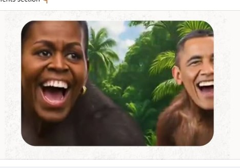 The Imagery: In the final seconds of the clip, an AI-generated or superimposed image appears showing the faces of Barack and Michelle Obama on the bodies of monkeys/apes, set to the song “The Lion Sleeps Tonight.”