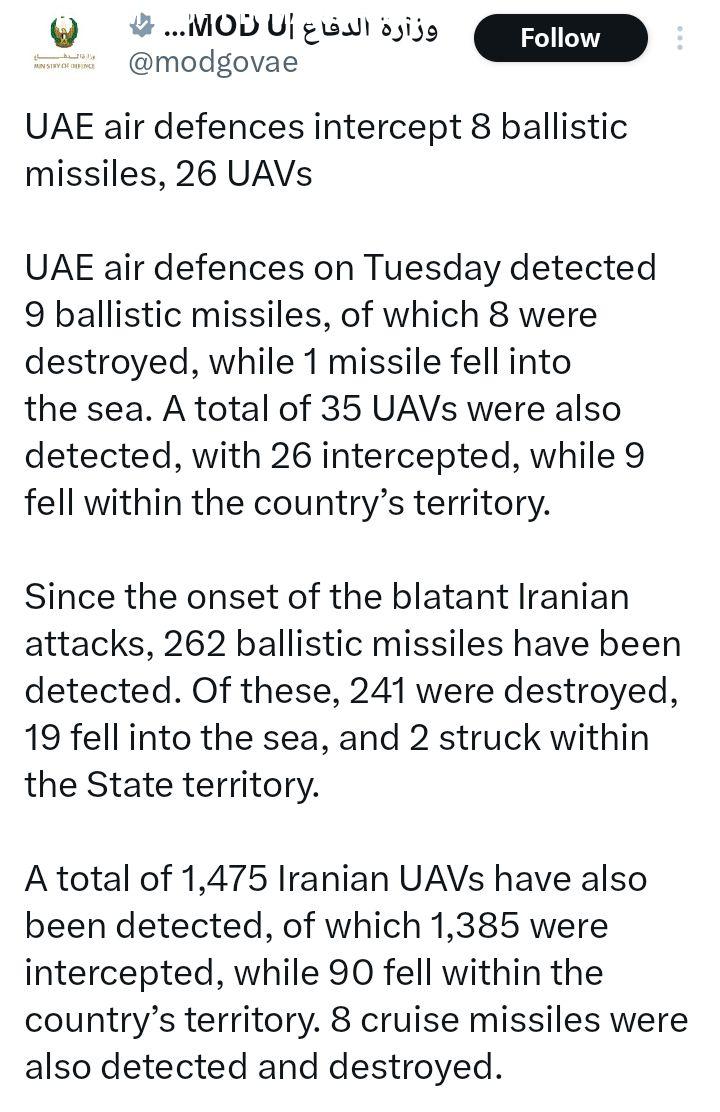 At least one Nigerian has been identified among 122 people injured following the interception of Iranian ballistic missiles in the United Arab Emirates (UAE) amid escalating tensions in the middle East. Authorities in the Gulf nation said their air defence systems have been responding to retaliatory missile attacks launched by Iran since the conflict began on February 28, 2026. In a statement on Tuesday, March 10, 2026, the United Arab Emirates Ministry of Defence disclosed that its air defence units had detected a total of 262 ballistic missiles fired from Iran since the start of the hostilities. According to the ministry, 241 of the missiles were successfully intercepted, while 19 landed in the sea. However, two missiles fell within the UAEs territory, leading to casualties and injuries. “These attacks resulted in six d8aths of Emirati, Pakistani, Nepalese and Bangladeshi nationalities, and 122 cases of minor and moderate injuries of Emirati, Egyptian, Sudanese, Ethiopian, Filipino, Pakistani, Iranian, Indian, Bangladeshi, Sri Lankan, Azerbaijani, Yemeni, Ugandan, Eritrean, Lebanese, Afghan, Bahraini, Comorian, Turkish, Iraqi, Nepalese, Nigerian, Omani, Jordanian and Palestinian nationalities, the ministry said.  Officials did not provide a breakdown of the number of injured persons from each country. Meanwhile, Nigerians stranded across several Gulf countries have appealed to the Federal Government of Nigeria to prepare repatriation flights in case the security situation deteriorates further.    The post Nigerian injured as Iran fires fresh missiles into UAE appeared first on Time.com.ng.