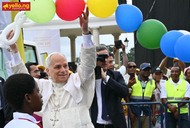 Pope Leo was welcomed at the Mongomo basilica in a supercharged atmosphere, with fireworks and a release of balloons celebrating his arrival, plus a tour through cheering crowds in the popemobile.